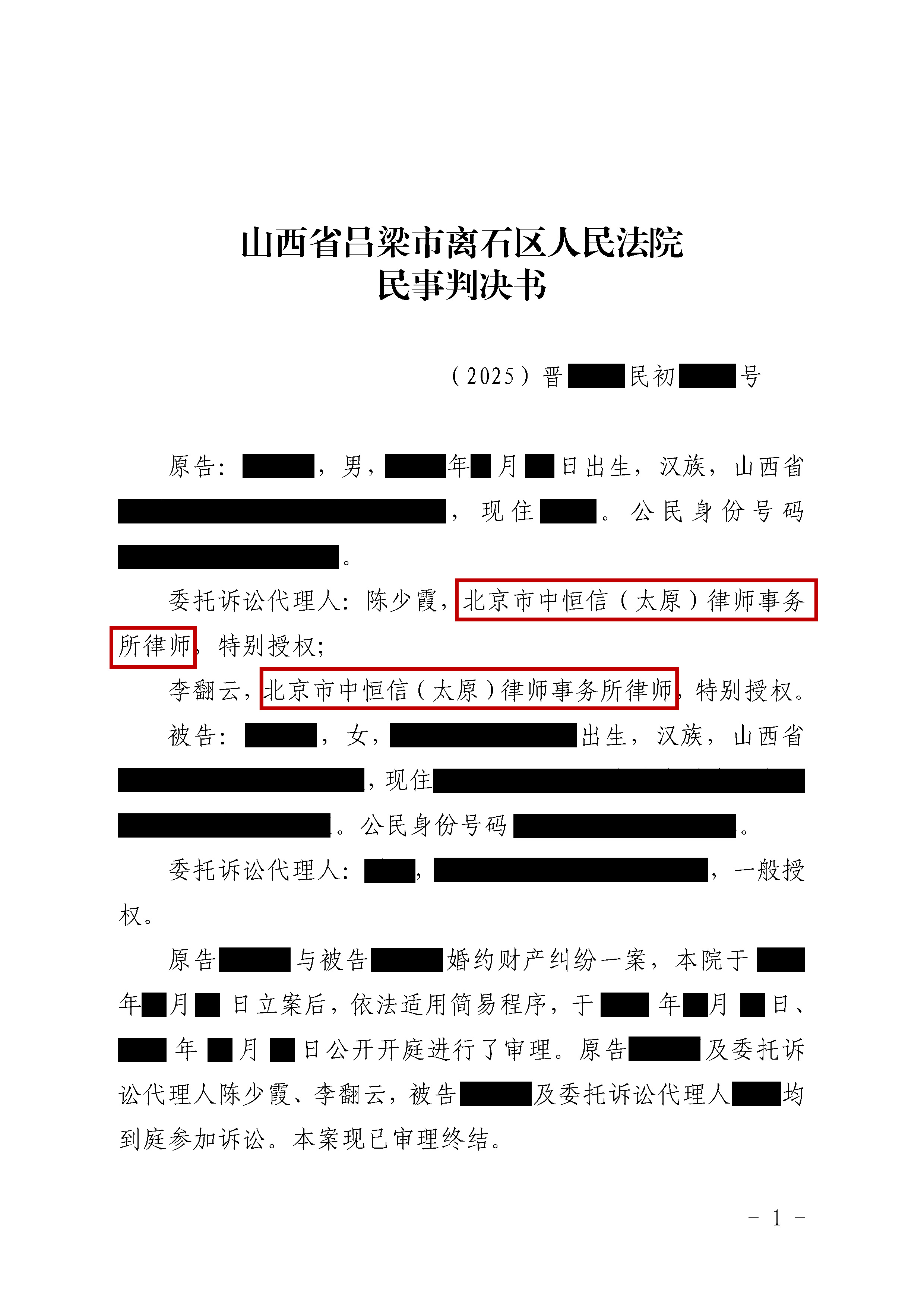 作为北京市中恒信律师事务所太原分所的资深律师,陈少霞律师在婚姻家庭、财产纠纷等领域拥有丰富的办案经验,始终秉持“专业、严谨、诚信、尽责”的执业理念,善于在复杂案情中精准找到突破口,以精细化的办案策略和强有力的庭审辩护,为当事人争取最大权益。此次案件的胜诉,再次彰显了中恒信律师事务所律师团队的专业素养和实战能力,赢得了广大当事人的信赖与认可。