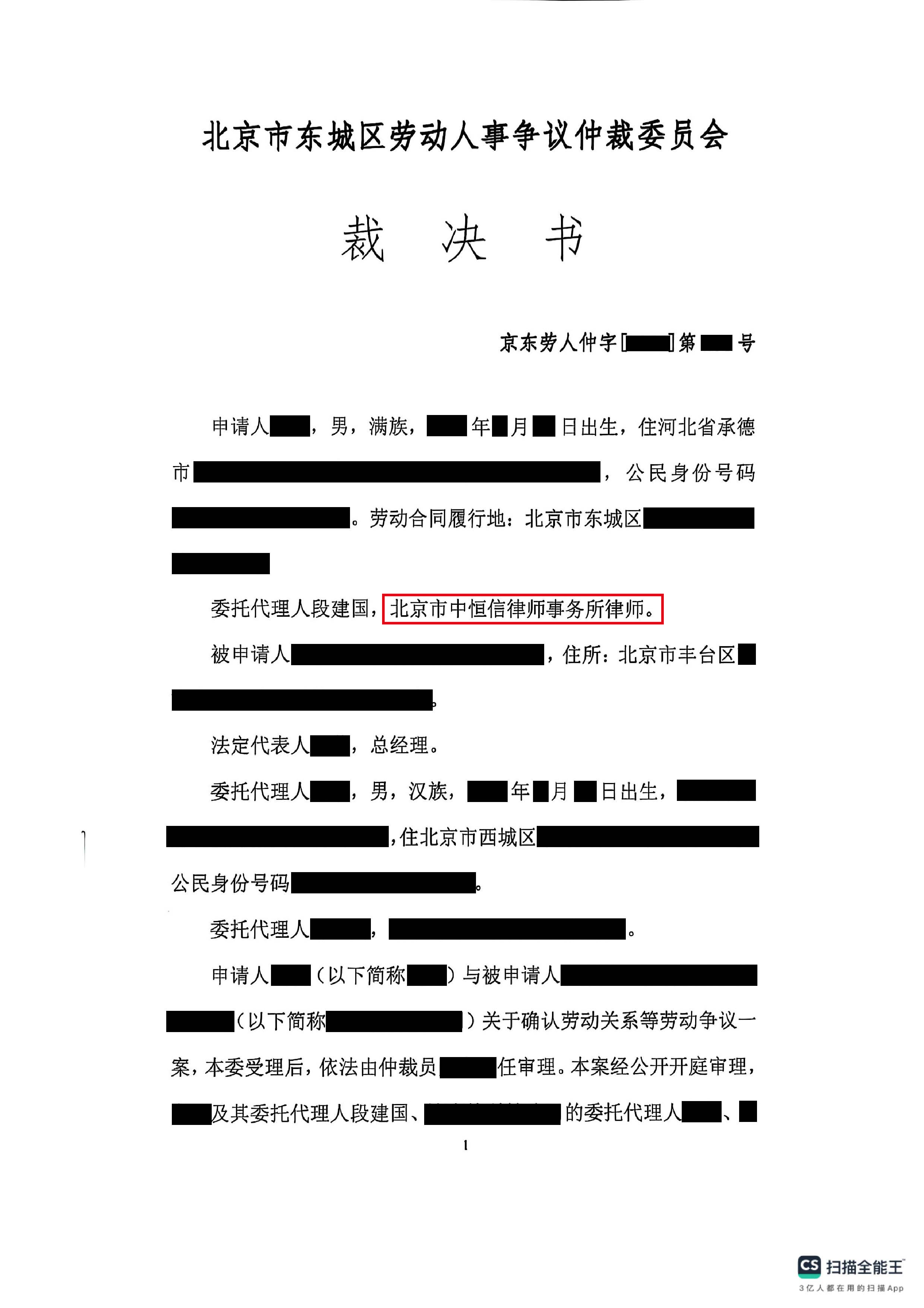 近日,北京市东城区劳动人事争议仲裁委员会就高某与北京某科技有限责任公司劳动争议一案作出终局裁决,裁定某科技公司向劳动者高某支付对应期间拖欠工资,并支付解除劳动合同经济补偿金。这一公正裁决的背后,离不开北京市中恒信律师事务所段建国律师的专业赋能。面对案件初期的诸多不利因素,段建国律师通过精准研判、调整办案思路,成功为当事人锁定胜诉关键,全力守护了劳动者的合法权益。