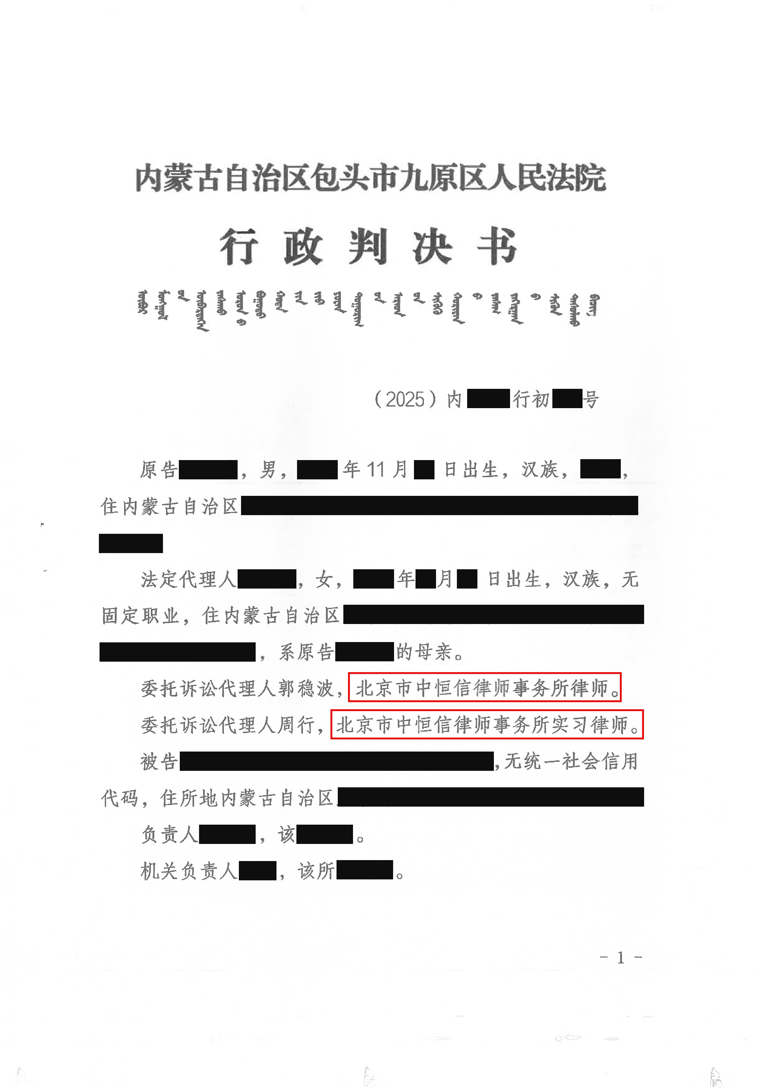 近日,由北京市中恒信律师事务所郭稳波律师代理的王某诉某第二派出所、某政府行政处罚及行政复议案,经内蒙古自治区包头市九原区人民法院审理,最终迎来胜诉判决:撤销涉案行政处罚决定书及行政复议决定书,为未成年人当事人扫清了伴随终身的违法记录隐患。