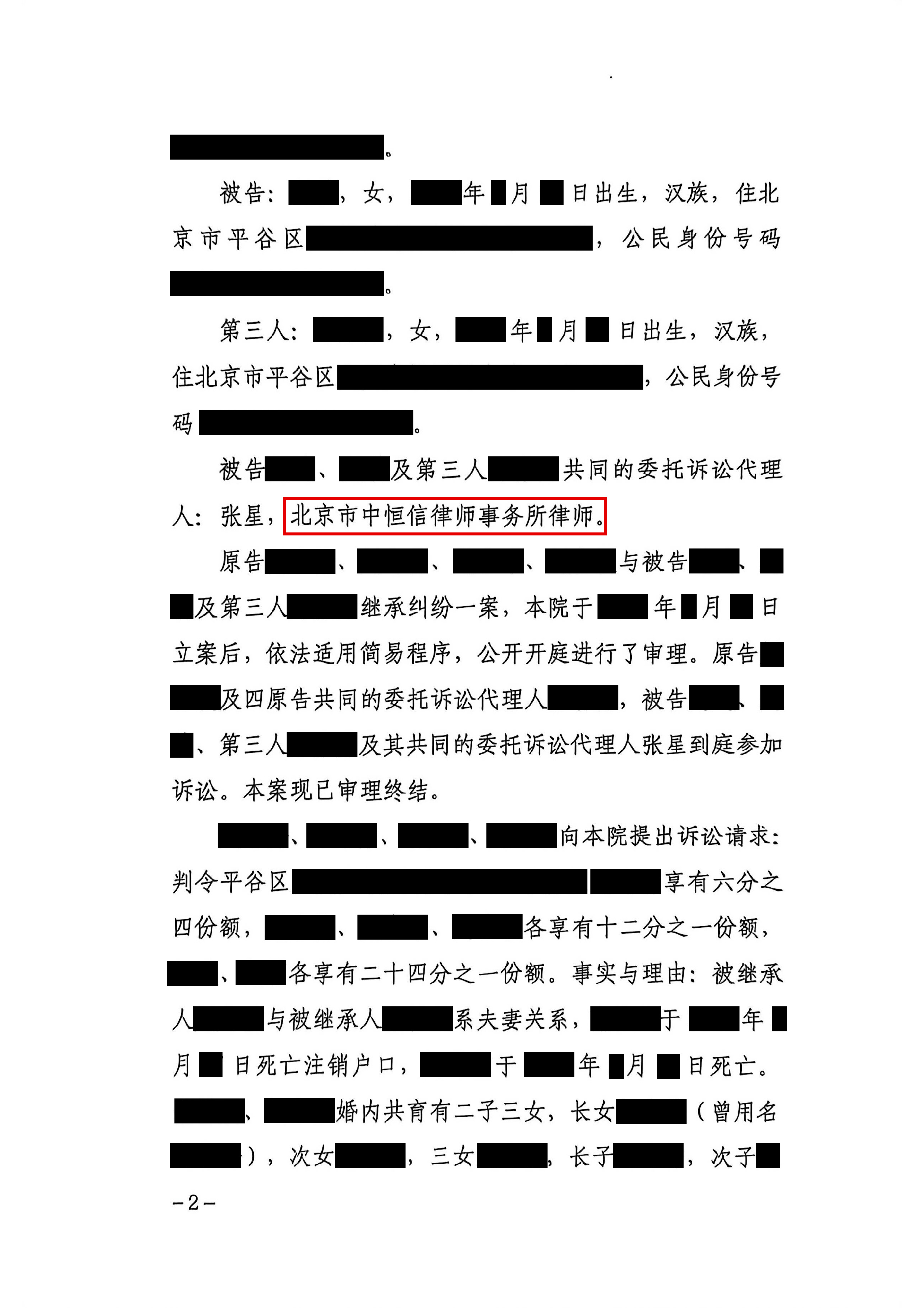 近日,北京市平谷区人民法院就一起牵动多方利益的继承纠纷案件作出一审判决,驳回原告方要求分割涉案房屋份额的全部诉讼请求。该案中,北京市中恒信律师事务所张星律师接受被告赵某迪、赵某萌及第三人邢某芳的委托,面对案件初期的不利局面,通过精准调整办案方案、深挖案件核心突破口,凭借专业的法律素养与缜密的逻辑论证,成功为当事人守住了房屋权益,赢得胜诉。