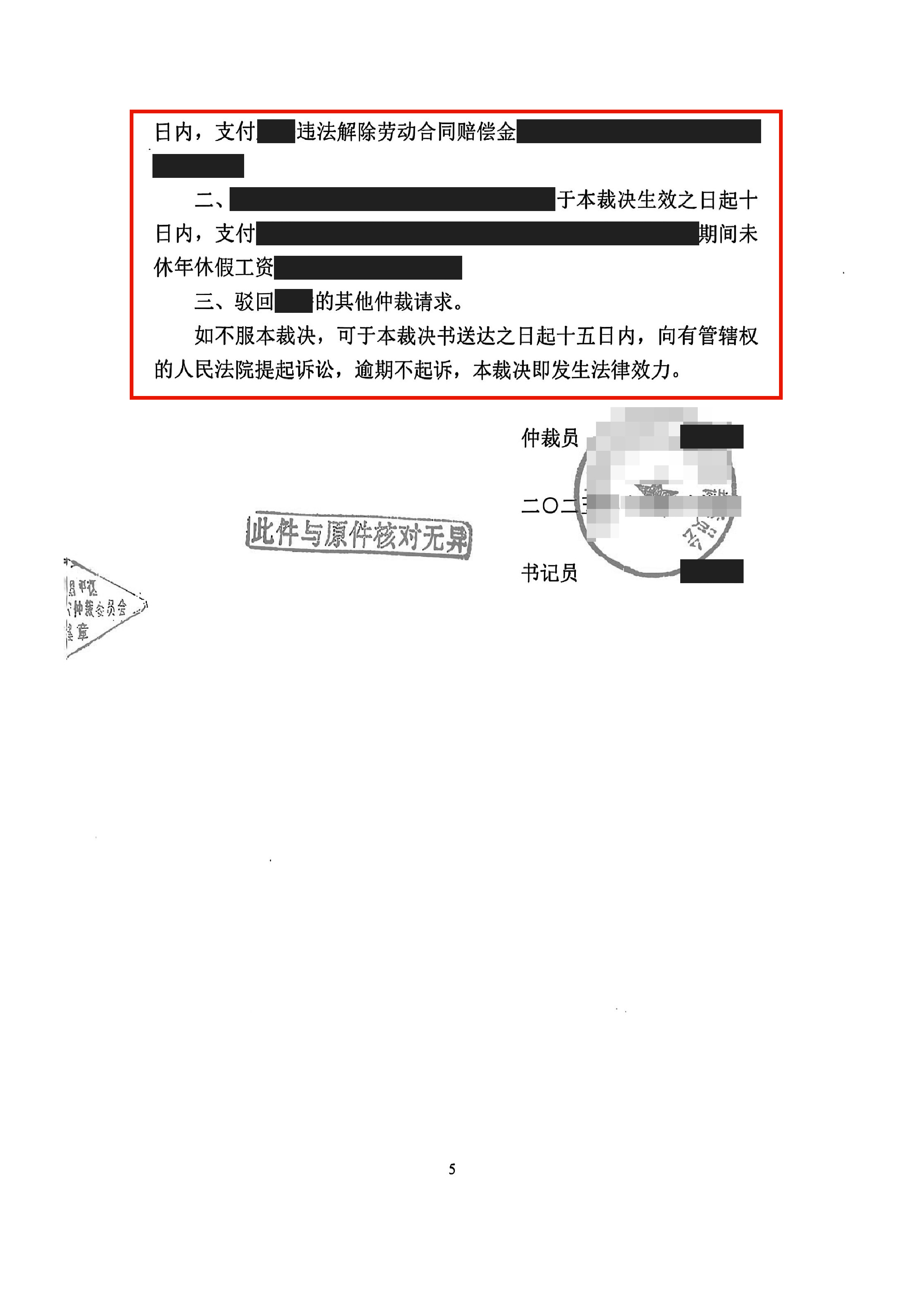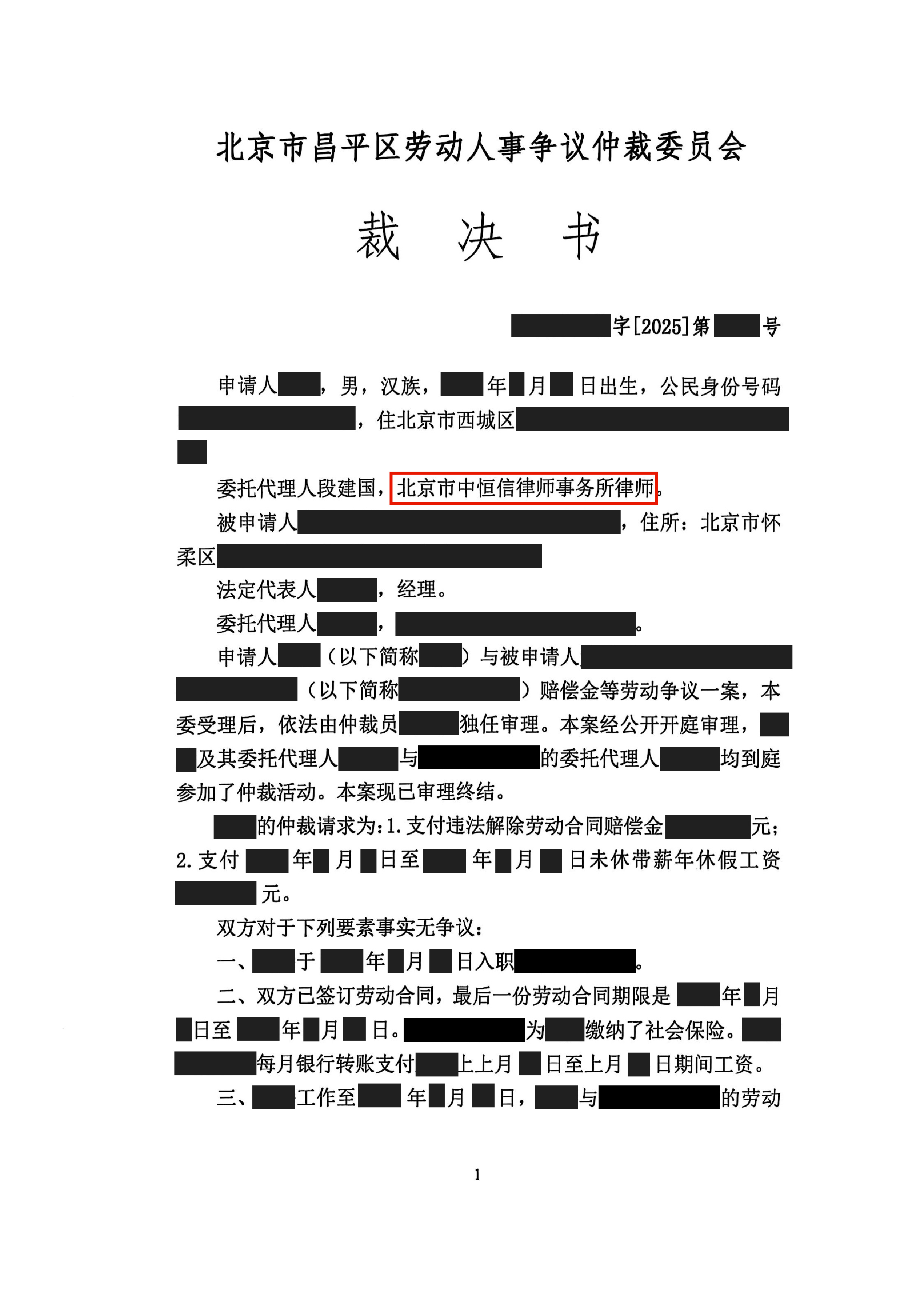经仲裁庭审理,最终采纳段建国律师的代理意见,认定公司单方解除劳动合同的行为构成违法,判决公司向刘某支付违法解除劳动合同赔偿金及未休带薪年休假工资。该案取得圆满胜诉,切实维护了劳动者的合法权益。