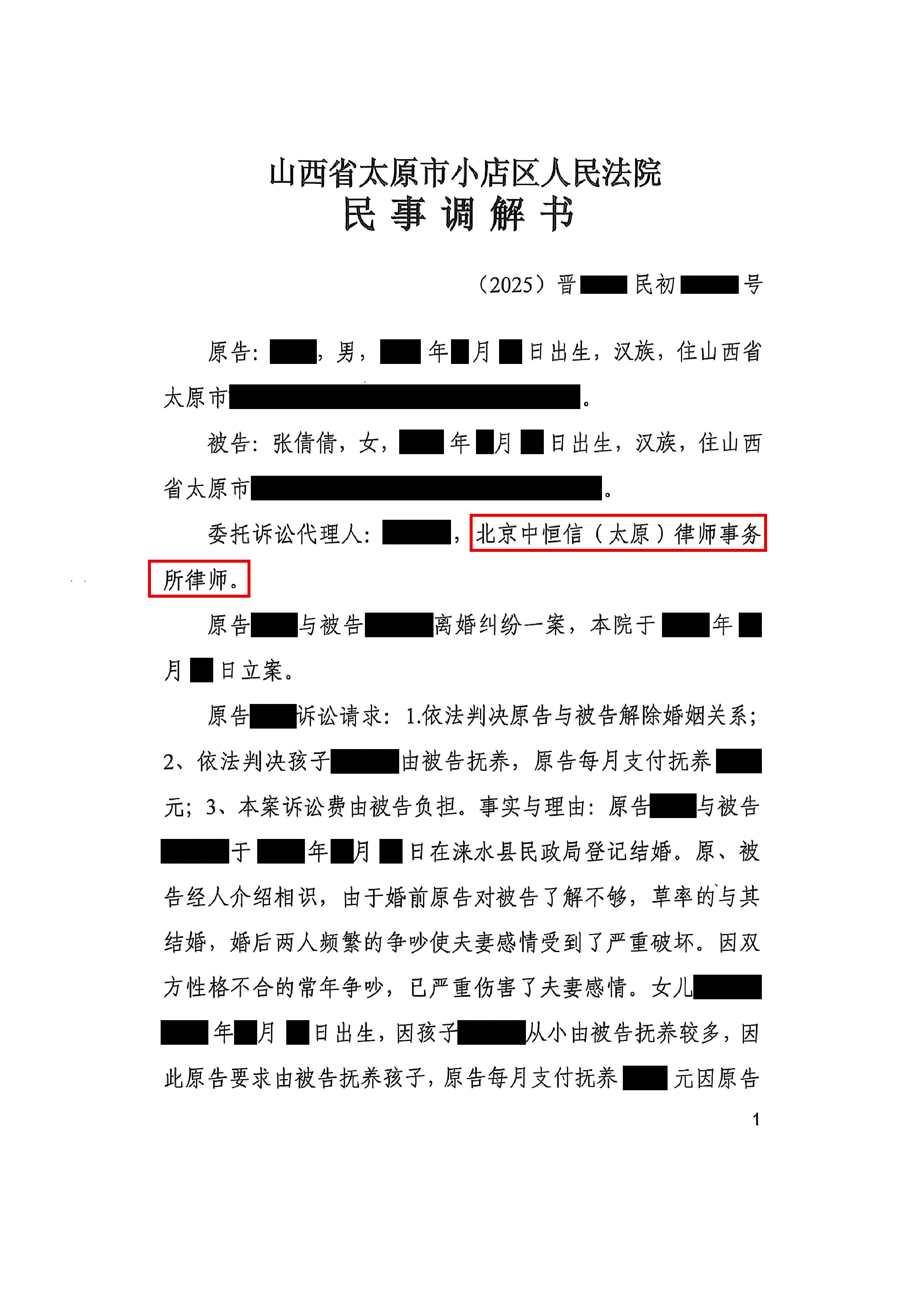 近日,山西省太原市小店区人民法院就冀某与张某倩离婚纠纷一案作出民事调解,在北京市中恒信律师事务所王英律师团队的全力代理下,该案最终达成合法有效调解协议,判决调解结果为双方自愿解除婚姻关系,婚生女抚养权、婚后共同车辆及共同债务均按公平原则妥善处置,当事人张倩倩的合法权益得到充分保障,该案圆满办结。此次案件代理过程中,王英律师凭借扎实的法律功底、灵活的办案思路,成功突破案件难点,为当事人争取到满意结果,彰显了中恒信律师的专业素养与责任担当。