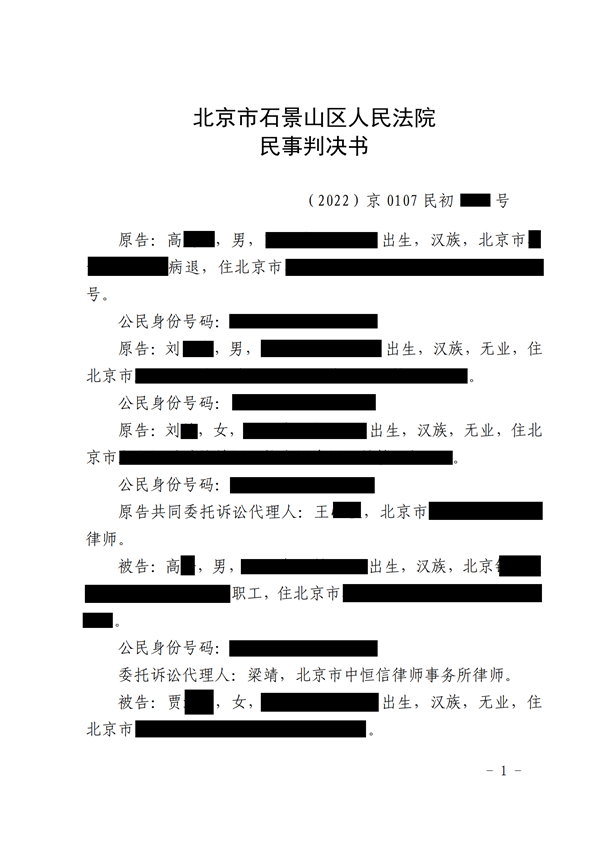 一、位于北京市***房屋的1/10份额由原告刘某(二)继承、1/10份额由原告刘某(三)继承、1/5份额由被告贾某(二)继承、1/5份额由被告高某(一)继承、1/5份额由被告高某(三)继承、1/5份额由原告高某(一)继承;