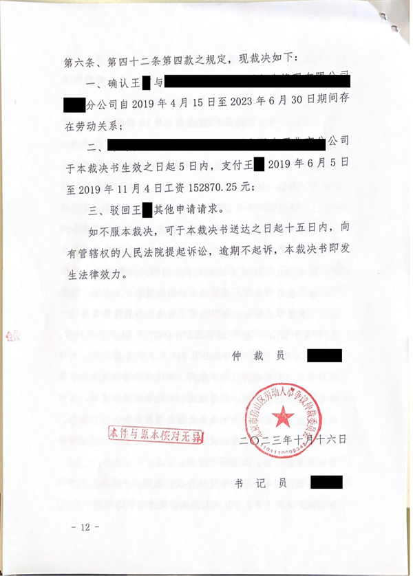 二、甲公司于本裁决书生效之日起5日内,支付王某2019年6月5日至2019年11月4日工资152870.25元。