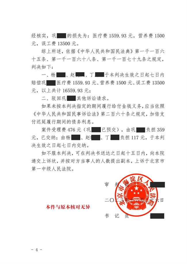 综上所述,依据《中华人民共和国民法典》第一千一百六十五条、第一千一百六十八条、第一千一百七十九条之规定,判决如下:杨某、赵某、丁某于本判决生效之日起七日内赔偿巩某医疗费1559.93元、营养费1500元、误工费13500元,以上共计16559.93元。