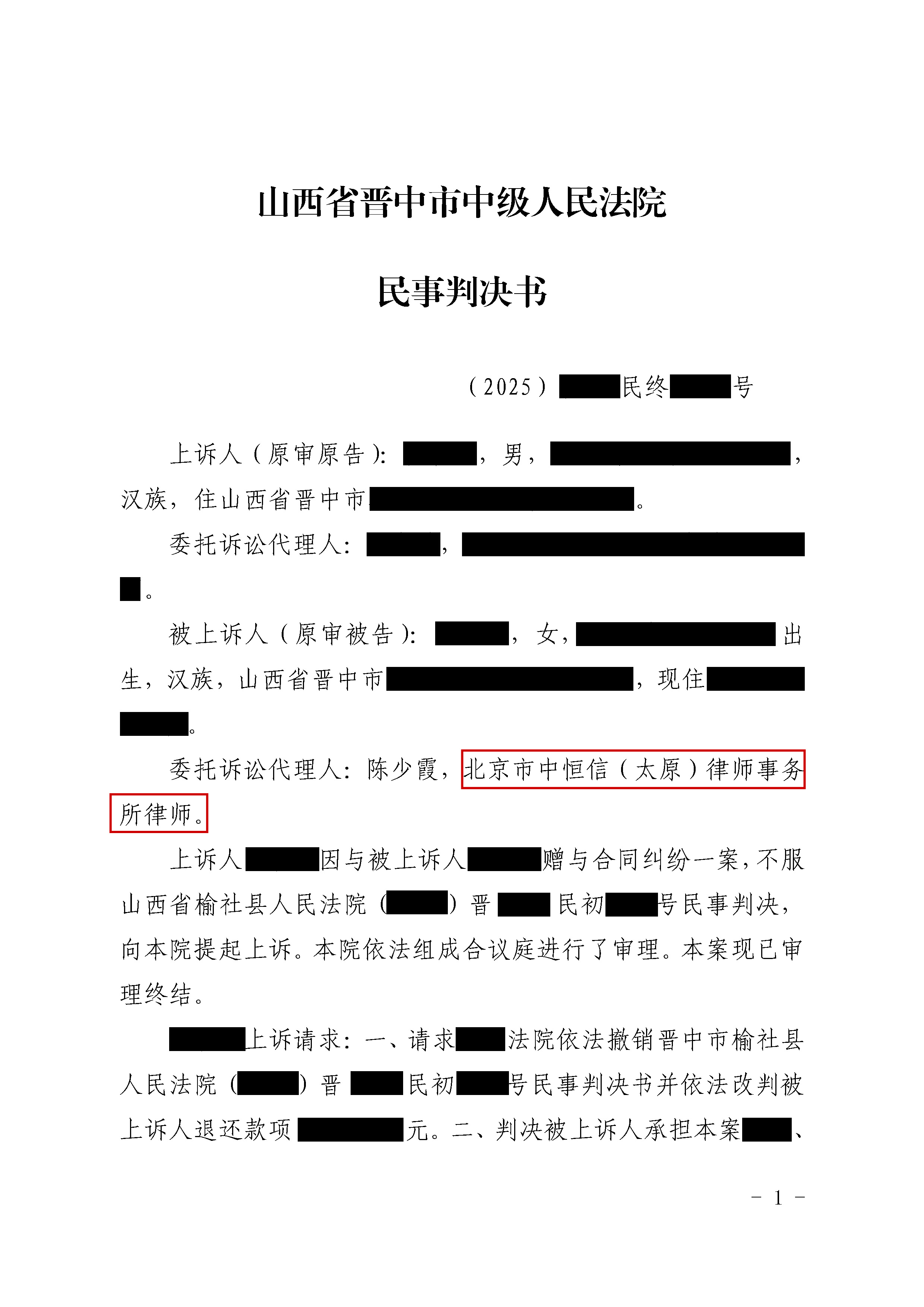 作为北京市中恒信(太原)律师事务所的骨干律师,陈少霞律师深耕婚姻家事与合同纠纷领域多年,凭借精准的案件研判能力、灵活的策略制定能力和扎实的庭审辩护能力,成功代理多起复杂疑难案件,为当事人捍卫合法权益。此次案件的胜诉,再次彰显了其专业的法律素养和丰富的实务经验。