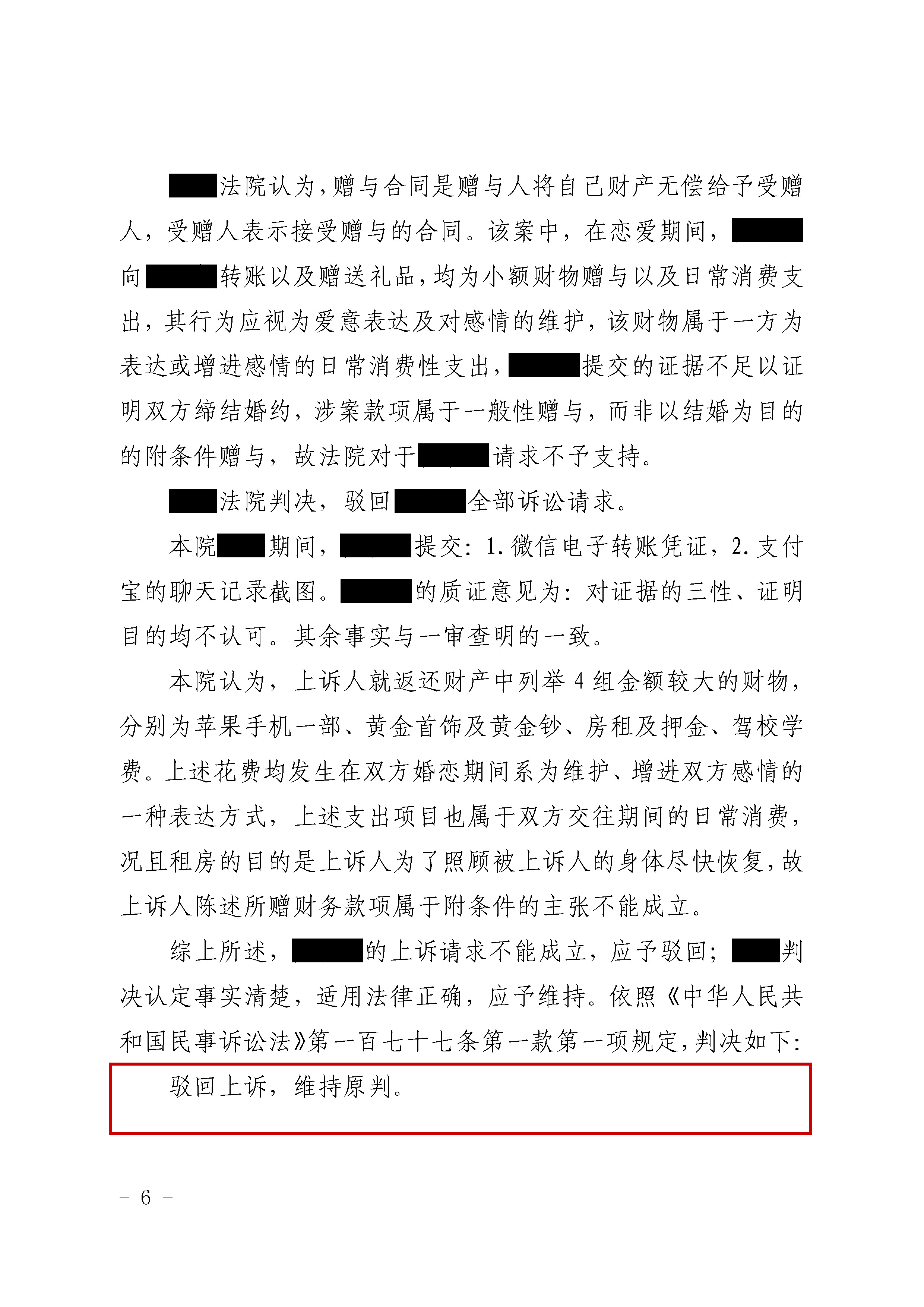 2025年12月4日,山西省晋中市中级人民法院作出终审判决。法院认为,上诉人主张的“大额财物”均发生在双方婚恋期间,属维护、增进感情的表达方式,且无充分证据证明双方存在缔结婚约的合意,其“附条件赠与”的主张不能成立。最终裁定驳回上诉,维持原判,二审案件受理费由上诉人承担。