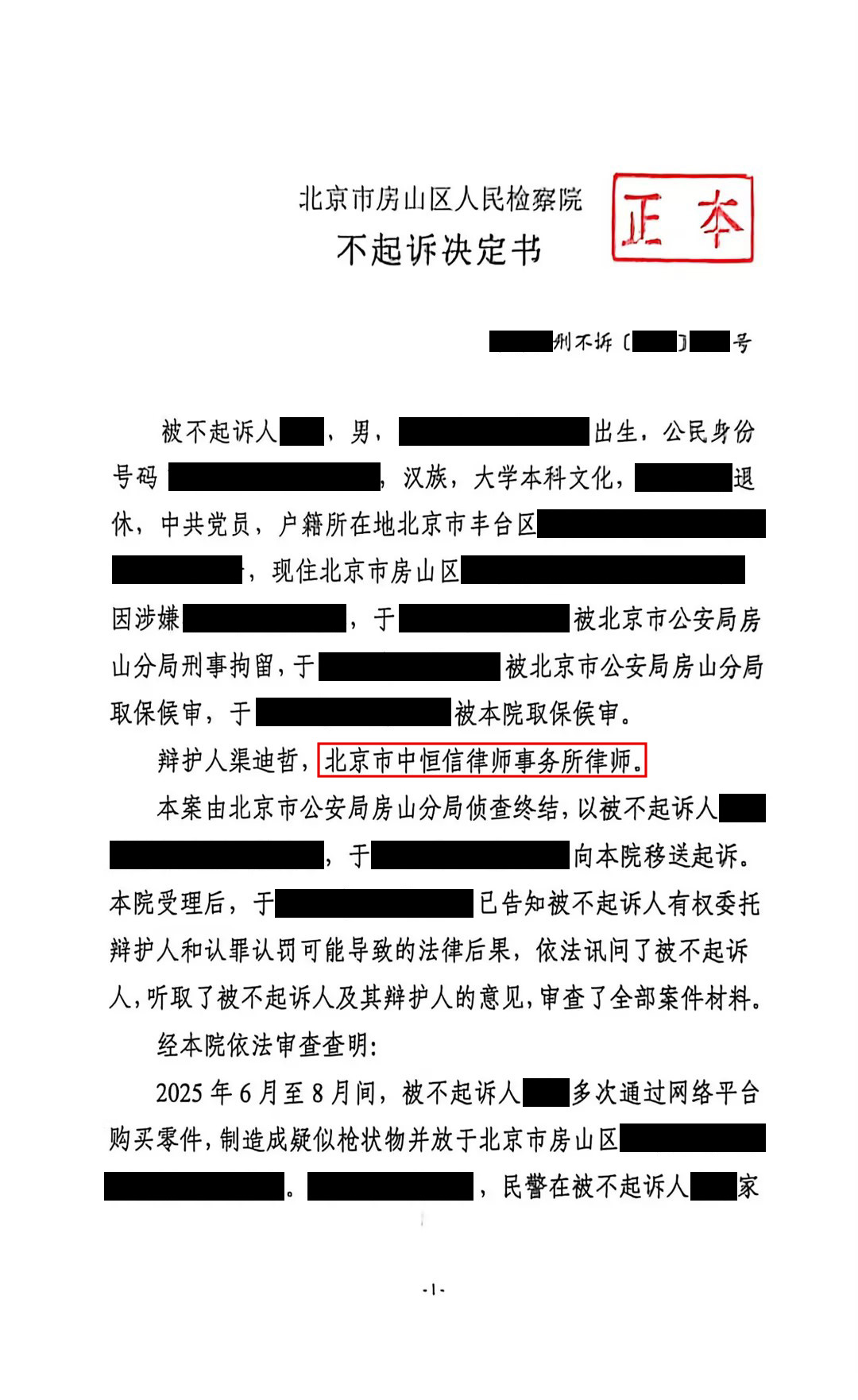 近日,由北京市中恒信律师事务所渠迪哲律师代理的李某涉嫌非法制造枪支一案,迎来关键节点——北京市房山区人民检察院依法作出不起诉决定,这一结果不仅让当事人免于刑事处罚,更彰显了宽严相济刑事政策下的司法理性与温度。而这份圆满结果的背后,离不开渠迪哲律师团队精准的案件研判、灵活的方案调整与扎实的辩护工作。