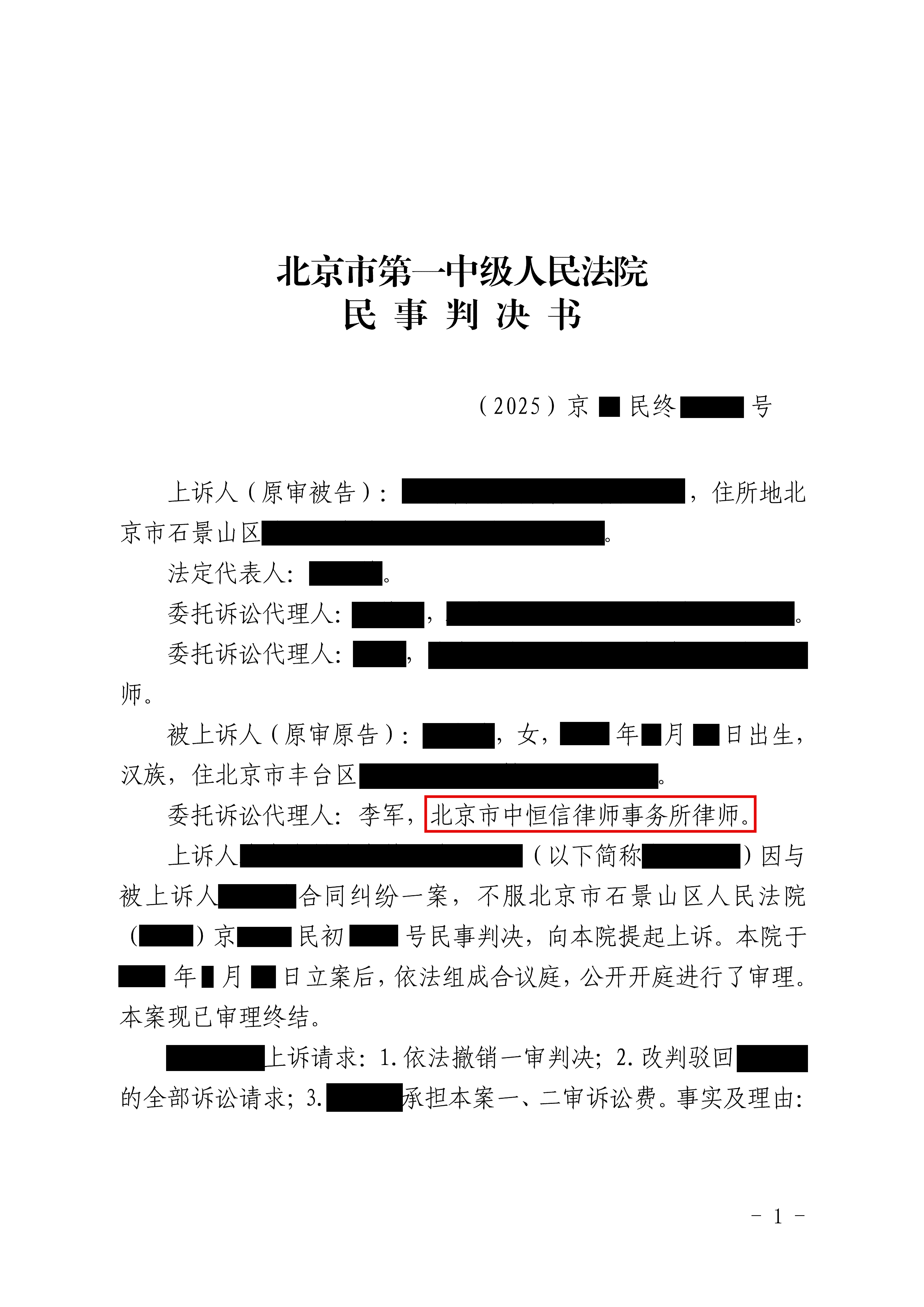 北京市第一中级人民法院审理后,认定一审事实清楚、裁判正确,判决驳回上诉、维持原判。案件两审终结,张某合法权益获全方面保障。判决生效后,当事人高度认可李军律师的专业能力与负责态度,直言其及时调整思路、找准案件突破口,是维权成功的关键。
