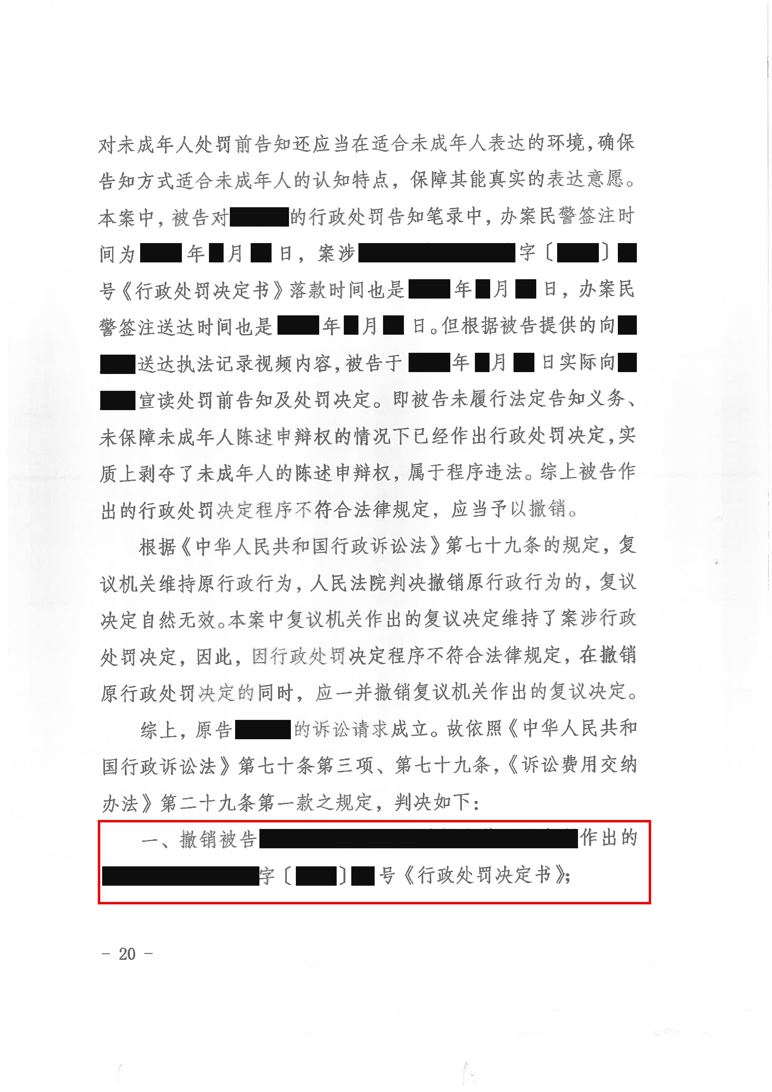 法院经审理认为,被告作出行政处罚决定前未依法履行告知义务,程序倒置行为剥夺了未成年人的陈述申辩权,属于程序违法;行政复议机关维持该违法处罚决定,亦不符合法律规定。最终,法院依照相关法律规定,判决撤销涉案行政处罚决定书及行政复议决定书,全额支持了原告的诉讼请求。
