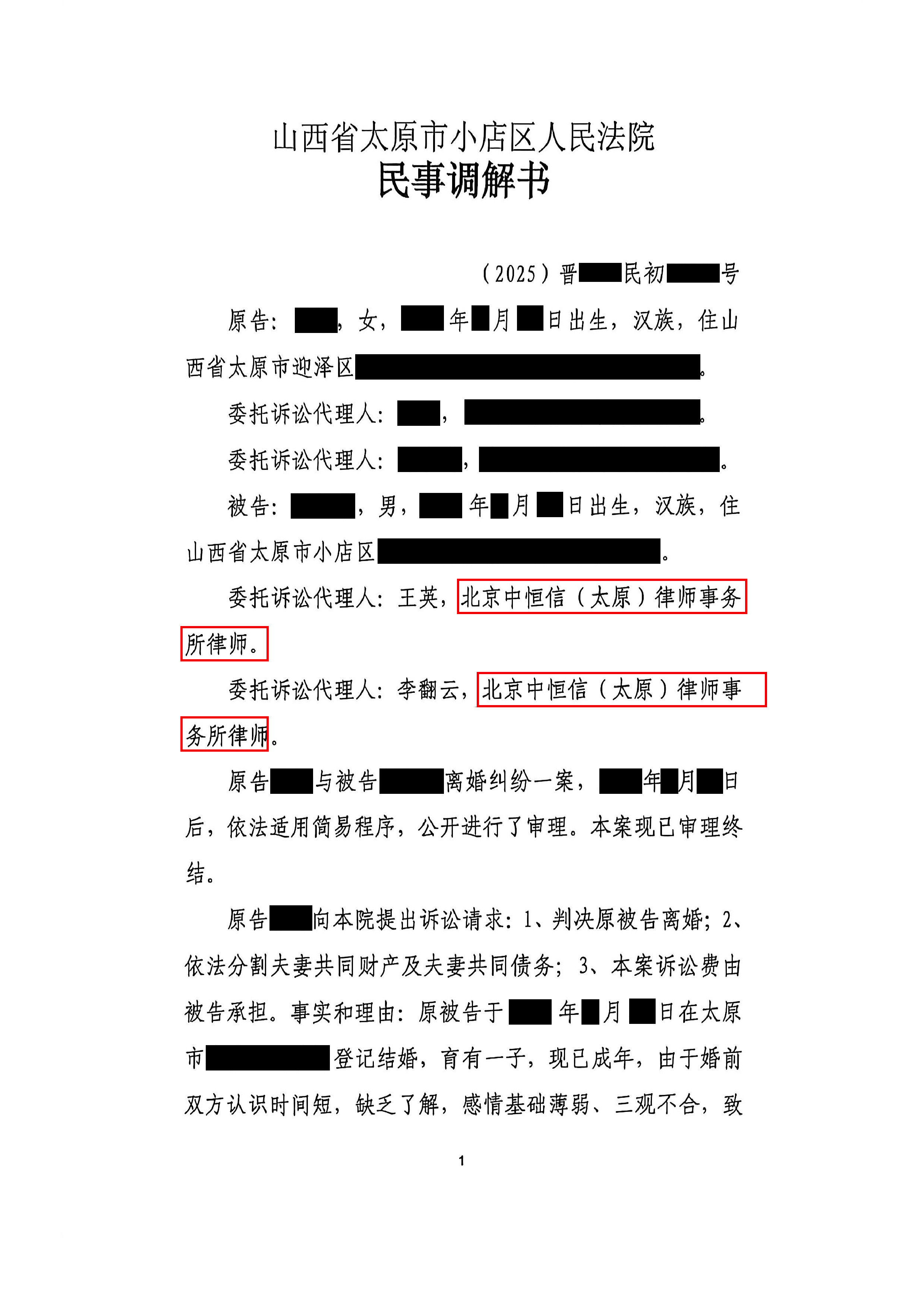 婚姻家事纠纷往往牵扯复杂的利益纠葛与情感羁绊,尤其涉及亲子关系争议时,更易让当事人陷入双重困境。近日,山西省太原市小店区人民法院就一起特殊离婚纠纷案件作出调解结案的有利结果,调解结果是为当事人争取到大量赔偿款和婚内所有财产。北京中恒信律师事务所太原分所王英律师团队凭借精准的案件研判、灵活的策略调整及扎实的专业能力,在看似难获突破的案件中交出了满意答卷,既弥补了委托人的情感与财产损失,也彰显了专业律师的维权力量。
