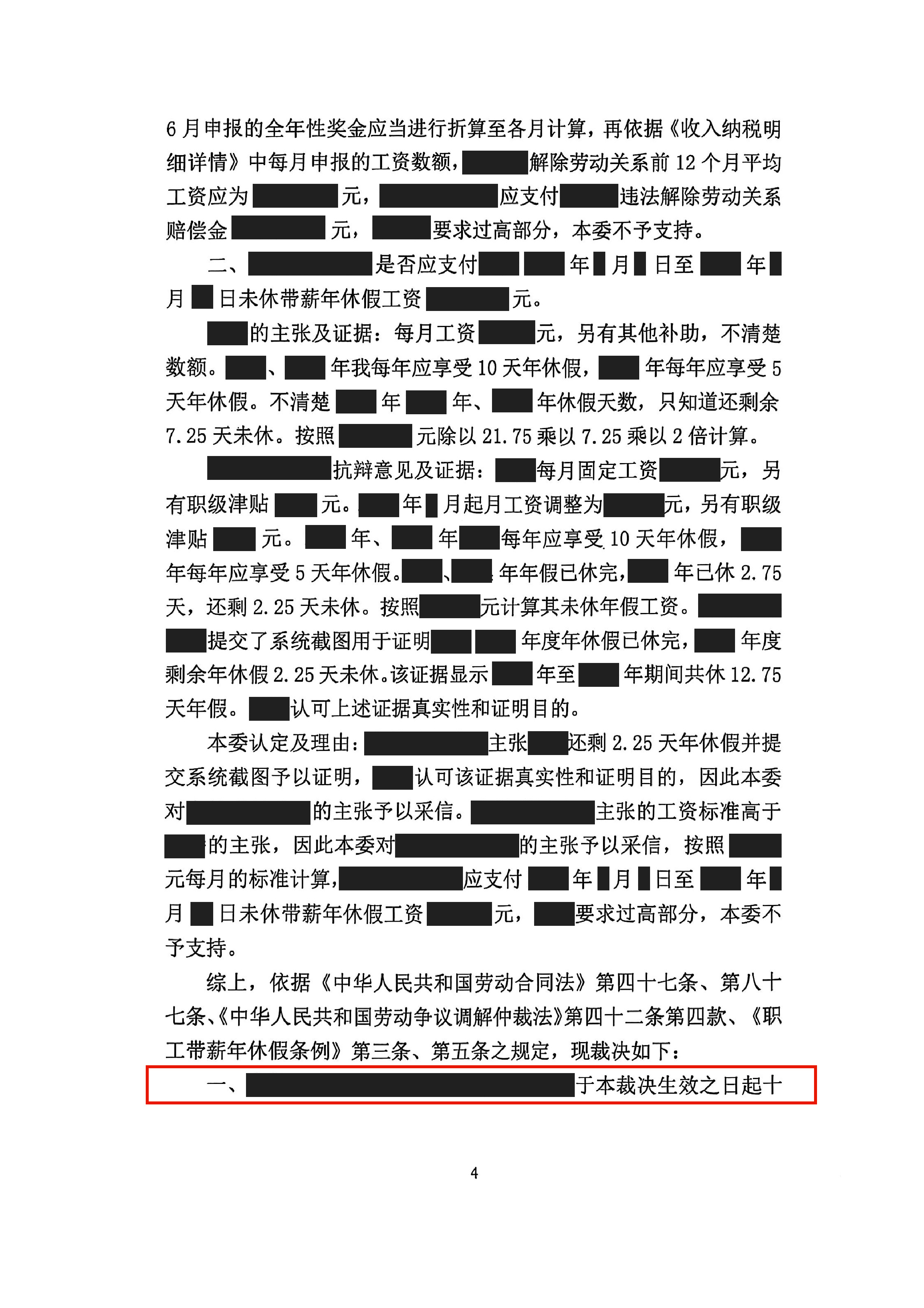 经仲裁庭审理,最终采纳段建国律师的代理意见,认定公司单方解除劳动合同的行为构成违法,判决公司向刘某支付违法解除劳动合同赔偿金及未休带薪年休假工资。该案取得圆满胜诉,切实维护了劳动者的合法权益。