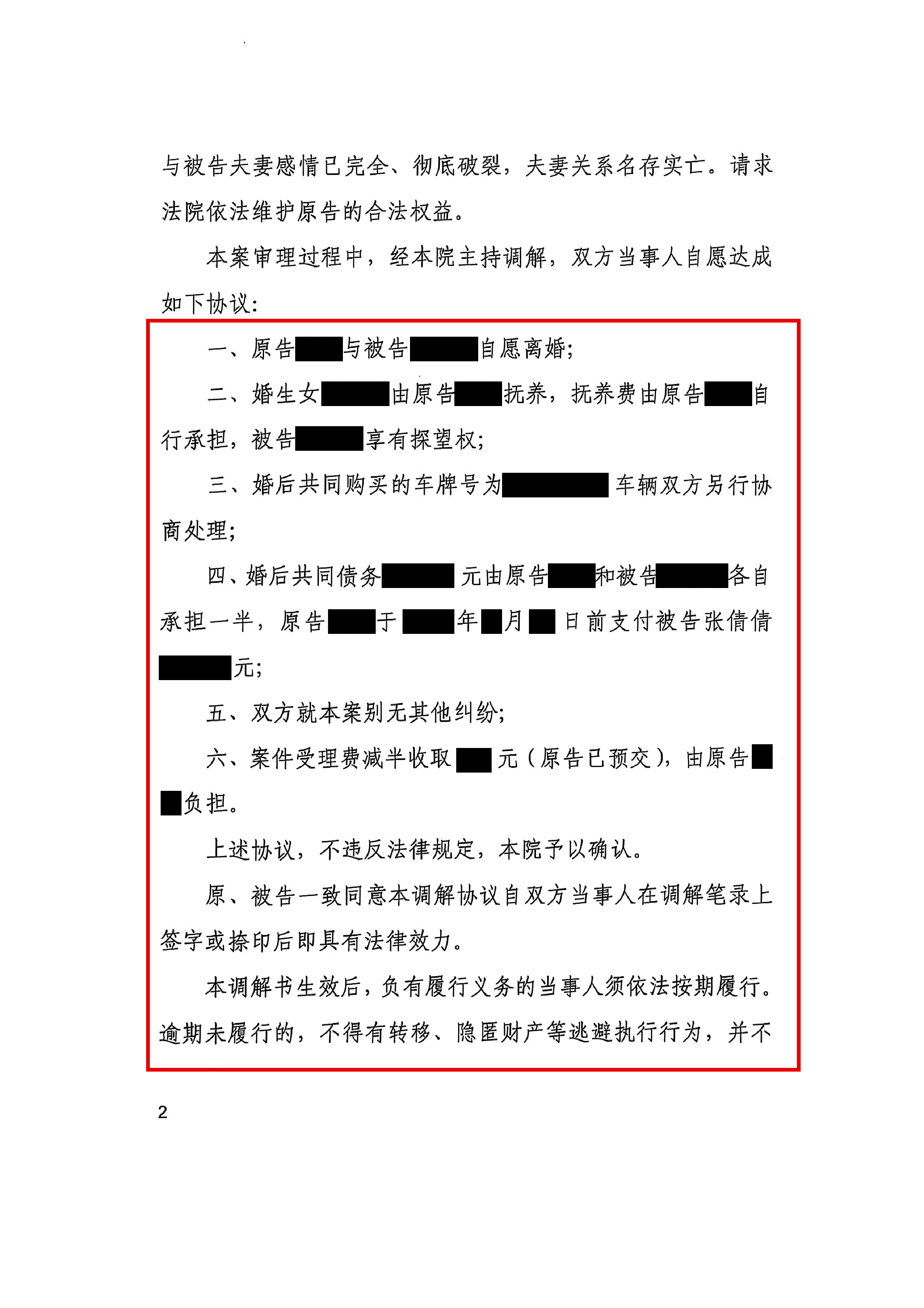 在王英律师团队的不懈努力下,该案审理过程中,经法院主持调解,双方当事人自愿达成一致协议:冀某与张某倩自愿解除婚姻关系,婚生女抚养权及相关费用达成合理约定,婚后共同车辆及共同债务均按公平原则妥善处置,双方就该案再无其他纠纷。